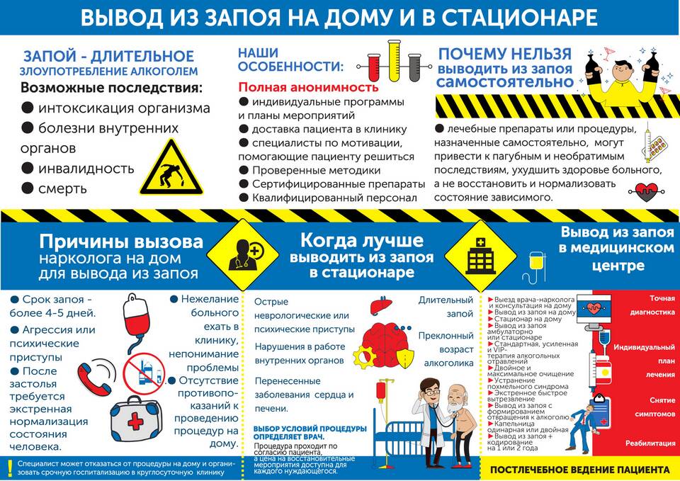 Домашнее выведение из запоя возможно только при легких и средних формах. При длительных запоях (более 5-7 дней) или наличии хронических заболеваний необходимо обращаться к наркологу. После выхода из запоя рекомендуется обратиться к специалисту для решения проблемы алкогольной зависимости.